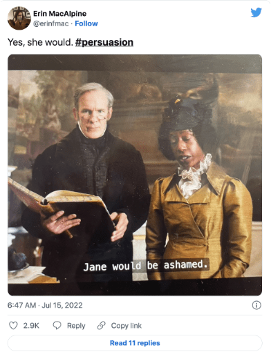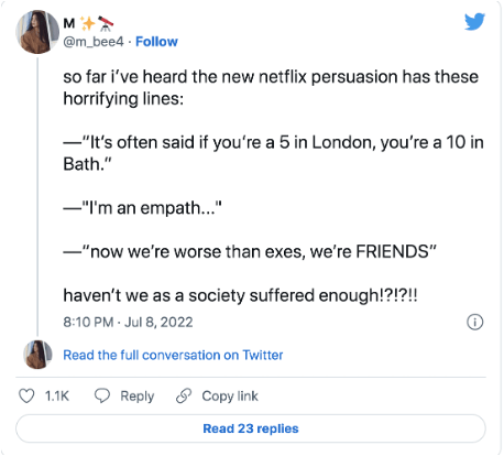 The new Persuasion adaptation’s attempt at blending modern lingo with a 17th-century period backdrop just doesn’t work for either audience. Why is that you may ask? It seems like the film doesn’t know what it wants to be. Is it a modern-day rom-com where the heroine says this to her friend on Facetime, or is it a classical film where she expresses her feelings over tea with a family friend? In reality, it’s a woman in 17th-century England dropping Gen-Z slang in a horse-drawn carriage. Viewers have all agreed that it was jarring to see such a visual and historical contradiction, especially concerning such iconic source material.