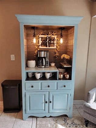 Step 5: Create a cozy vibe! Add some personal touches to make your coffee station inviting. Consider adding plants, artwork, or a small chalkboard for writing fun coffee quotes! To enhance the effect you can even add some cool lighting.