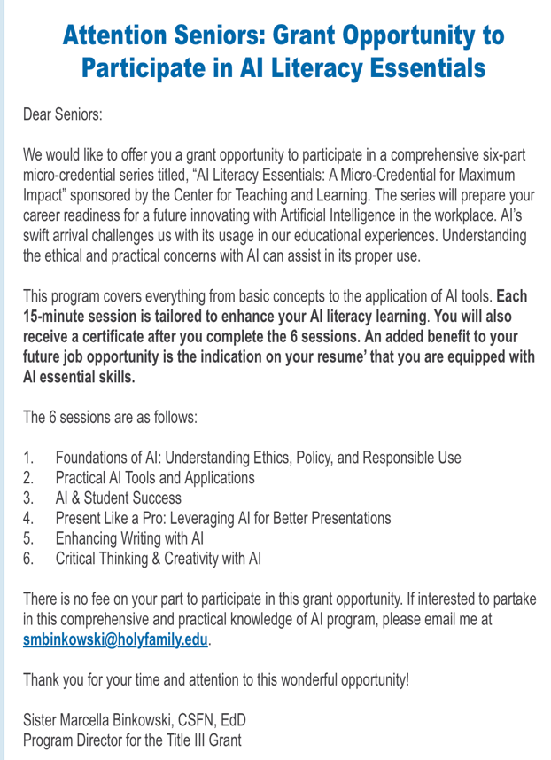 Holy Family is offering students a free Perplexity Pro plan if enough students sign up with their school email in the coming weeks. Perplexity is an education-oriented program akin to ChatGPT and Microsoft Copilot. It can be used for ethical and unethical purposes, such brainstorming for a paper outline — or, as a peer tested, to write a whole paper based on a prompt, all within a few seconds. Additionally, Holy Family has made more attempts to get ahead of this rising AI tide, arguably too late, through the organization of a free seminar to teach students ethical, real-world usage of AI. As its poster (shown later in this article, along with more information on the event) states, the event organizers also want to gain information about student usage of AI thus far; this data will surely be interesting to me, and something that will provide a jumping-off point for future ventures into writings on student perspectives on AI. There are also grant opportunities (shown above) for students interested in learning AI usage principles and literacy. This new approach can be viewed as Holy Family staying hip to new trends, attempting to stay marketable in a changing higher educational market. This signals a shift from school administration simply attempting to curb usage of AI, which is nigh impossible, to attempting to direct and control its usage, as well as inform students of ethical usage standards.